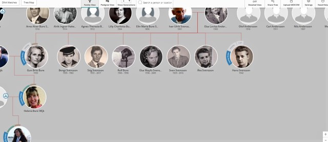 Ett släktträd, åtminstone några generationer bakåt i tiden, är en ovärderlig hjälp när du och dina kommande DNA-matcher söker efter gemensamma anor. Under fliken ”my Family Tree” kan du skriva in de anfäder- och mödrar som du känner till, eller ladda upp befintligt släktträd som GEDCOM. Du kan även lägga in bilder och annan information.