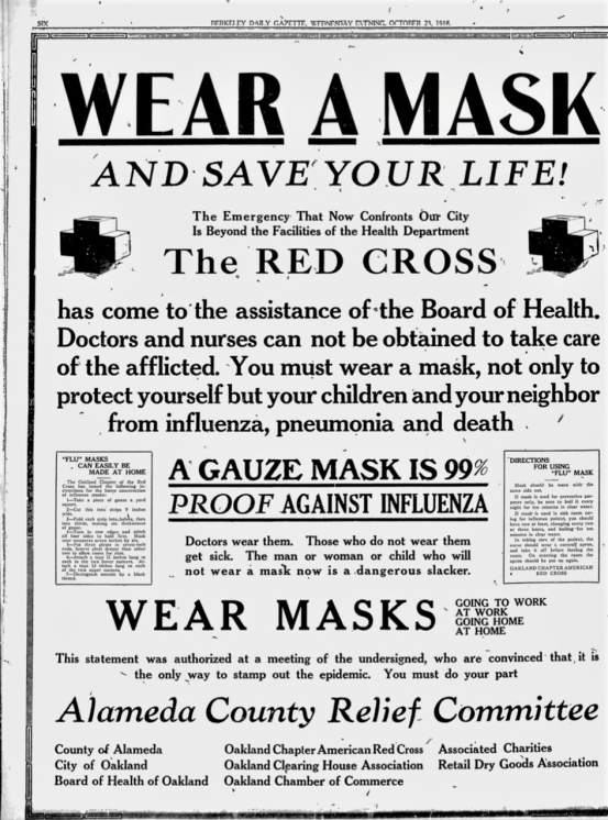 ”Du måste bära ansiktsmask, inte bara för din egen skull utan även för att skydda dina barn och din granne från influensa, lunginflammation och död”. Berkeley Daily Gazette onsdag 23 oktober 1918