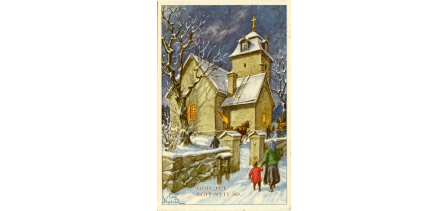 Ja, så kläddes jag riktigt varmt och allt var snart klart för avfärd. Pappa var i stallet och ordnade med mat till hästen ”Blacken” som skulle ha en liten hötapp och havre för att ha tålamod att vänta på kyrkfolket. Ja så var allt ordnat. Vi bäddades ned i släden och iväg for´t. Det var nästan en mil till kyrkan och på vägen lyste det i varje fönster och bjällerklang hördes från hundratals andra kyrkobesökare.