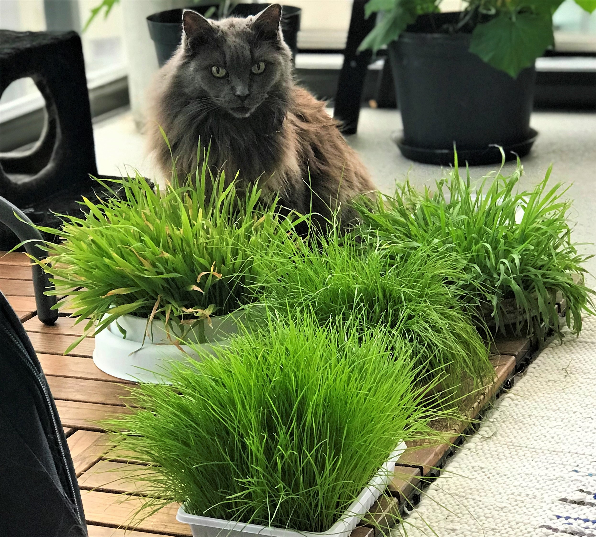 Kattgräs kan man aldrig få för mycket av tycker lilla kissen Esther, så det odlar vi för fullt.