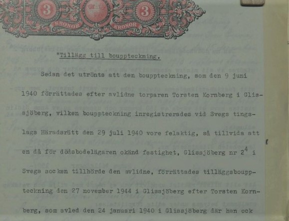 Min farfars mamma Anna Matilda Kornberg var den siste i vår släkt som bodde i Glissjöberg. Hon gick bort 1949 och enligt bouppteckningen ägde hon diverse renskinn, konserveringsapparater, möbler, gamla kläder, 1 ko, 7 höns och en andel i Härjedalens konsumtionsförening a´ 100: – samt 500:- i kontanter.