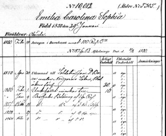 Den lilla flickan Emilia Carolina Sophia lämnades till Allmänna barnhuset i Stockholm i februari 1850, när hon var två veckor gammal. Hennes föräldrar, som var antecknade som ”okända” betalade 100 riksdaler vid överlämnandet av barnet. Några månader senare, i april samma år, kom min morfars mormors far, soldaten Jan Petter Bure, till barnhuset och hämtade den lilla flickan som sedan växte upp tillsammans med hans familj i Bladåker, Uppland. Flickan växte upp som Emilia Carolina Sophia Bure och flyttade sedermera till Vitsjö i Estuna där hon fick en tjänst hos Georg Ivar Christoffer Hjalmar Leijonhielm och hans hustru Ingeborg Emma Sofia Blûm. Emilia gifte sig sedermera med bonden Erik Matsson i Estuna och fick med honom flera barn.