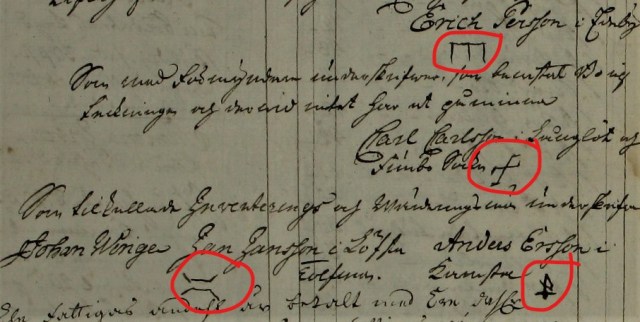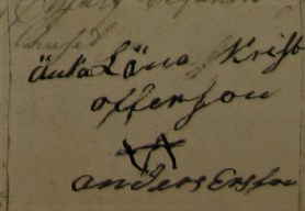 Min morfars morfars mamma, Lena Christiansdotter hade högsta betyg i läs- och skrivkunskap, men valde ändå att signera sin makes bouppteckning med ett bomärke i Knutby 1805. Märket, som ser ut att vara två ”A:n” (varav en bokstav är upp- och nedvänt), kan möjligen vara ett gårdsmärke från Burviks gård, som ärvts från Lenas svärfar Anders Andersson.