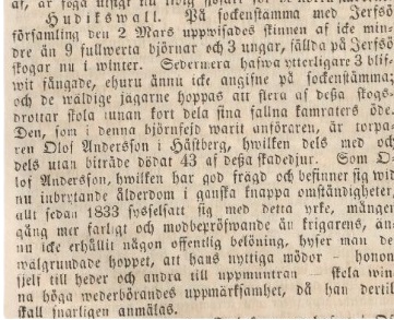 Olof Andersson lyckades fälla 43 björnar under sin livstid och omnämndes bland annat i tidningen ”Ljusnan” 1851: ”Då jordestämma med Järvsö församling den 2 mars uppvisades skinnen av icke mindre än 9 fullvuxna björnar och 3 ungar, fällda på Järvsö skogar nu i vinter. Sedermera hava ytterligare 3 blivit fångade, ehuru ännu icke angivna på sockenstämma, och de väldiga jägarna hoppas att flera av dessa skogs brottar skola innan fort dela sina fallna kamraters öde. Den som i denna björnfejd varit anföraren, är torparen Olof Andersson i Hästberg, vilken dels med och dels utan biträde dödat 43 av dessa skadedjur. Som Olof Andersson, vilken har god frägd och befinner sig vid nu inbrytande ålderdom i ganska knappa omständigheter, allt sedan 1833 sysselsatt sig med detta yrke, mången gång mer farligt och modbeprövande än krigarens, ännu icke erhållit någon offentlig belöning, hyser man det välgrundade hoppet, att hans nyttiga mödor – honom själv till heder och andra till uppmuntran – skola vinna höga vederbörandes uppmärksamhet då han därtill skall snarligen anmälas”.