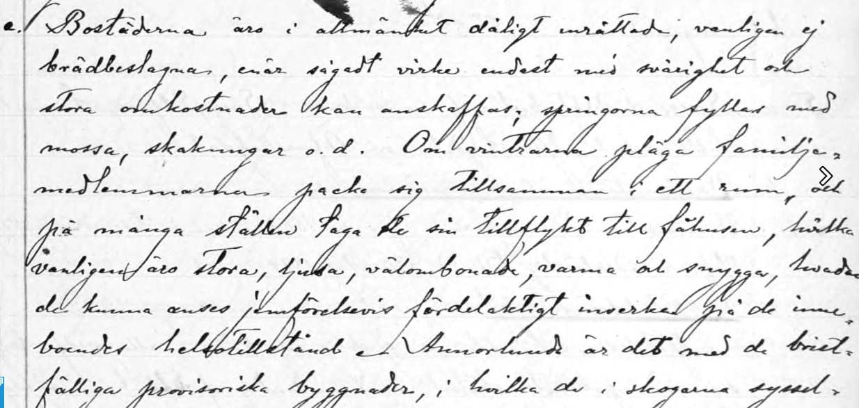 Till Sveg med omnejd kom många skogsarbetare. Säsongsarbetarna bodde i så kallade ”finnkojor” i skogen, undermåliga byggnader, som enligt doktor Möller var ”provisoriskt upptimrade låga blockhus med eldstad i mitten, rökfång i taket och sovbritsar längs väggarna”. I en sådan koja trängdes ofta 30–40 personer i kylan. Läkaren bekymrade sig bland annat över att männen ofta drack 30 koppar kaffe per dag och att de sov i samma kläder som de arbetade i. Skogsarbetarnas föda bestod främst av fläsk och kaffe och maten låg ofta och ruttnade så att den blev oätlig. ”Fisken får ofta ligga och surna innan den förtärs, mjölken förvandlas till ”tätmjölk” och osten får ruttna” skriver han och tillägger ”Spirituosa används naturligtvis i överflöd av den arbetande klassen, de gånger de ha tillfälle att skaffa sig sådan.”