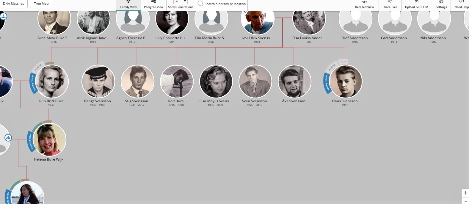 Majoriteten av dagens svenskar tillhör mtDNA-haplogrupp H, Helenas grupp, som kan spåras till Västra Asien för 20 -25 00 år sedan. Denna grupp kom hit via Anatolien (dagens Turkiet) för ca 6000 år sedan. (H)elenas grupp var väldigt duktiga på att tämja djur och att odla grödor och man tror att haplogrupp U, som levde en mer nomadiserande tillvaro, successivt trängdes undan och vandrade norrut när bondefolket etablerade sig här.