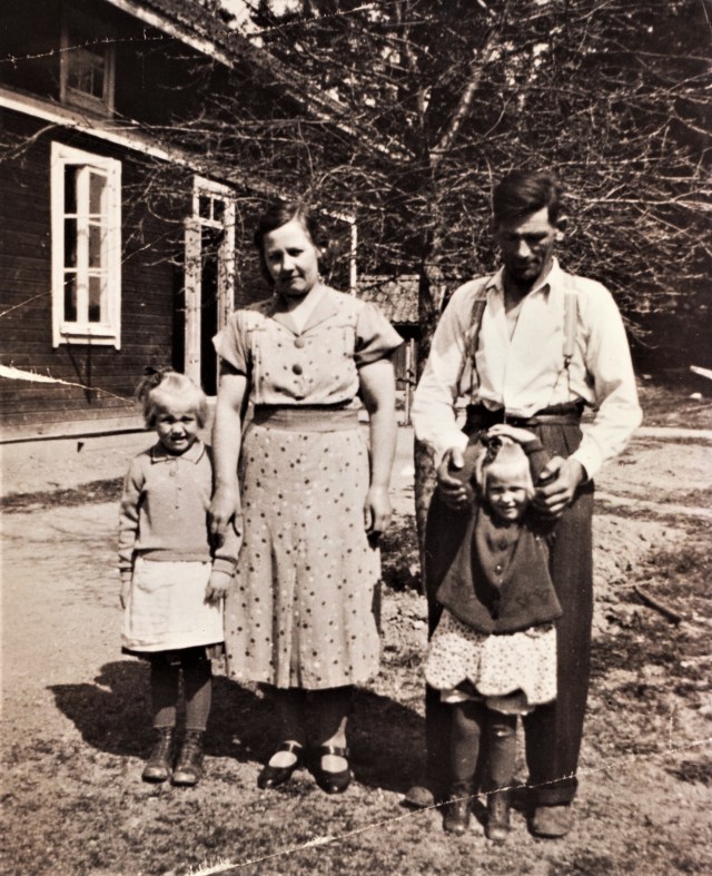 Mormor och morfar tillsammans med döttrarna vid statarlängan. Morfar vägrade att lyda order och gick till arbetet med vit skjorta varje dag. Foto: Privat
