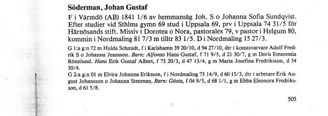 Vem var han egentligen, farmors farfar Johan Gustaf Söderman? Jag har inte lyckats hitta några ättlingar som kan berätta mer om honom. Så här beskrevs han i Oknytt 1993: ”Ännu på 1930-talet berättades om hur komministern Johan Gustaf Söderman, som dog 1915, kunde gå direkt in från dikesgrävningen, förrätta vigsel eller dop, hänga av prästkappan och gå ut igen, hela tiden med smorläderstövlarna på”.