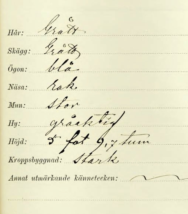 Stark kroppsbyggnad, blå ögon, grått skägg, rak näsa och en stor mun hade den här fången