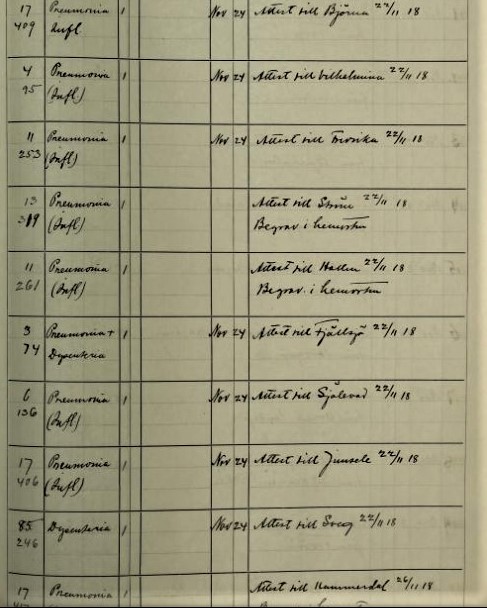 Sida upp och sida ned i dödboken för 1918 vittnar om att många patienter på Frösö mentalsjukhus avled i sviter av spanska sjukan.