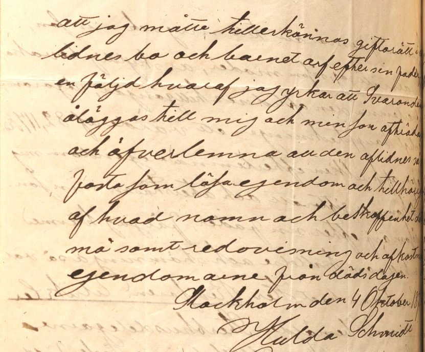 Farmors farmor Hulda Schmidt drog familjen Posse inför domstol och krävde ”…att jag måtte tillkännas giftorätt av den avlidnes bo och barnet arv efter sin fader, en följd varav jag yrkar att svaranden åläggas till mig och min son…(svårläst)… och överlämna all den avlidnes såväl fasta som lösa egendom och tillhörigheter av vad namn och beskaffenhet de må, samt redovisning och avkastning av egendomarna från dödsdagen. Stockholm den 4 Oktober 1871, Hulda Schmidt”.