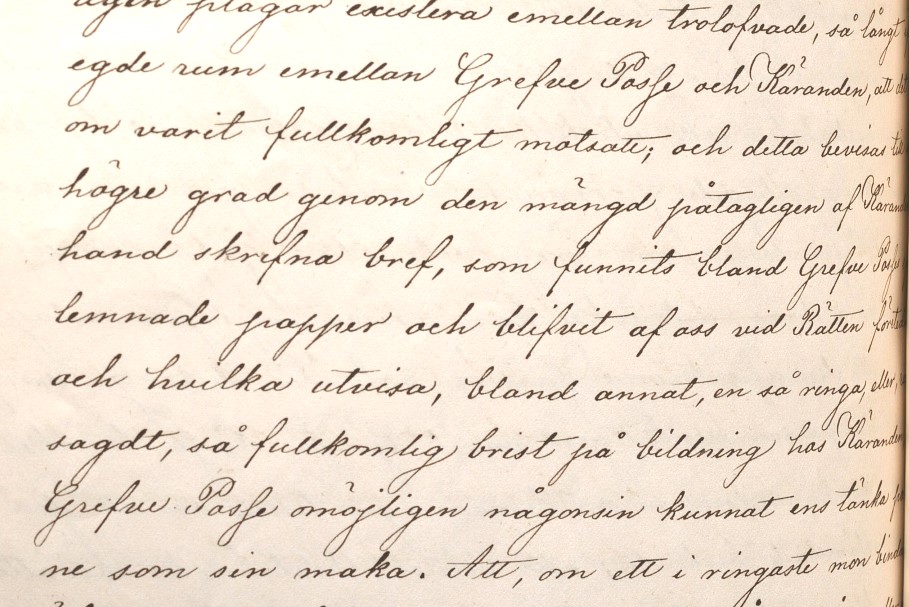 Greven och Hulda hade inlett sitt förhållande i början av 1860-talet och genom åren hade man brevväxlat flitigt med varandra. Nu lyftes dessa brev fram av grevens syskon (och hans arvtagare), inför rätten. Man ifrågasatte om trolovning dem emellan ens hade ägt rum eftersom greven och Hulda absolut inte passade för varandra – ”och det bevisas till högre grad genom den mängd påtagligen av kärandens (Hulda Schmidt) hand skrivna brev, som funnits bland greve Posses efterlämnade papper och blivit av oss vid rätten förevisade, och vilka utvisa, bland annat, en så ringa, eller rättare sagt, så fullkomlig brist på bildning hos käranden att Greve Posse omöjligen någonsin kunnat ens tänka sig henne som sin maka.”
