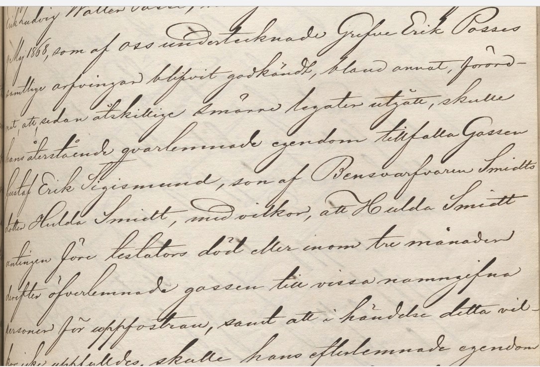 Grevens testamente fanns som bilaga till domstolshandlingarna: ”9 Maj som av oss undertecknade Gustaf Erik Posses samtliga arvingar blivit godkänt, bland annat förordnat, att, sedan åtskilliga smärre legater utgått, skulle hans återstående kvarlämnade egendom tillfalla gossen Erik Gustaf Sigismund, son av bensvarvaren Smidts dotter Hulda Smidt, med villkor att Hulda Smidt, antingen före testators död eller inom tre månader därefter överlämnade gossen till vissa namngivna personer för uppfostran…”
