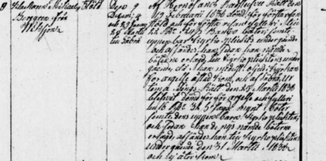 De följande åren är hon antecknad som piga på gårdarna Bers, Ina, Sund, Ellnö, Renskalla och Sunnanhed. En märklig anteckning i husförhörslängden fångade min uppmärksamhet lite extra. Det står nämligen att Vendela Christina genomgick absolution år 1790. Absolution (förkortades ”abs.”) var en kyrklig ritual som den ogifta modern genomgick när hon fått barn, då hon blev förlåten för sina synder. Den arma flickan Vendela Christina var endast 13 år gammal när hon genomgick absolution. Hennes barn finns inte i födelse- och dopboken och måste ha avlidit före förlossningen.