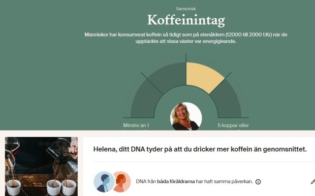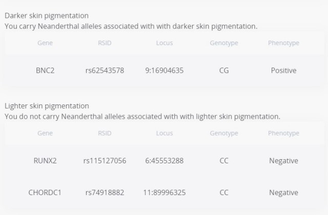 En gammal grottmänniska När mitt DNA-resultat dyker upp på sidan så kan jag läsa att 2.07 procent av mitt DNA är ett arv från Neandertalmänniskan, närmare bestämt från en 38,000 år gammal Neandertalare som hittades i en belgisk grotta (Spy Cave) 1886. Enligt resultatet har jag ”Denisovan score 122” och har ärvt 0.22 procent DNA från Denisova-människan. Här får jag bland annat veta att min genotyp för SNP rs5743618 innebär en lägre risk för att jag ska utveckla inflammatoriska sjukdomar. Min genotyp för SNP rs17544225 är inte associerad med en högre risk att drabbas av autoimmun sjukdom som exempelvis MS (Multipel skleros) eller diabetes.