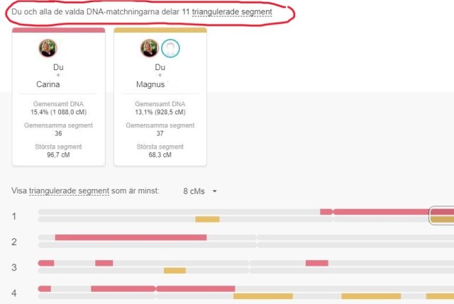 De blåa och röda ”gubbarna” hjälper dig att se hur du är släkt med dina DNA-matcher