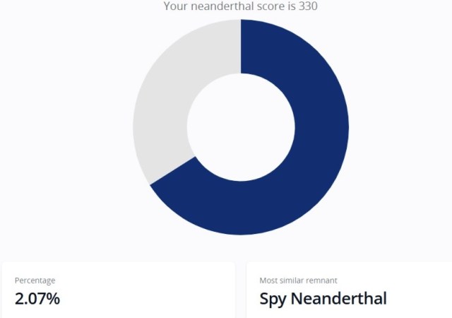 Nu är det fastställt att jag till viss del är en Neandertalmänniska. Jag hade hoppats att jag härstammade från en lite mer civiliserad hominid, men tji fick jag. Enligt mitt DNA-resultat härrör 2.07 procent av mitt DNA från en 38 000 år gammal Neandertalare som hittades i en belgisk grotta (Spy-Cave) år 1886.