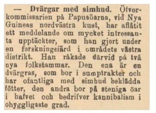I början av 1900-talet rapporterade svenska dagstidningar om två dittills okända folkstammar som levde i sumptrakterna vid Nya Guineas nordvästra kust. Den ena folkgruppen höll till ”på steniga öar i hafvet och bedrifver kannibalism i ohyggligaste grad”, medan den andra gruppen bestod av betydligt beskedligare varelser, dock väldigt märkliga. Enligt Karlskrona Veckoblad bestod denna folkstam av en ”dvärgras” med ”ofantliga, med simhud beklädda fötter”. (Karlskrona Veckoblad 1903-10-14)