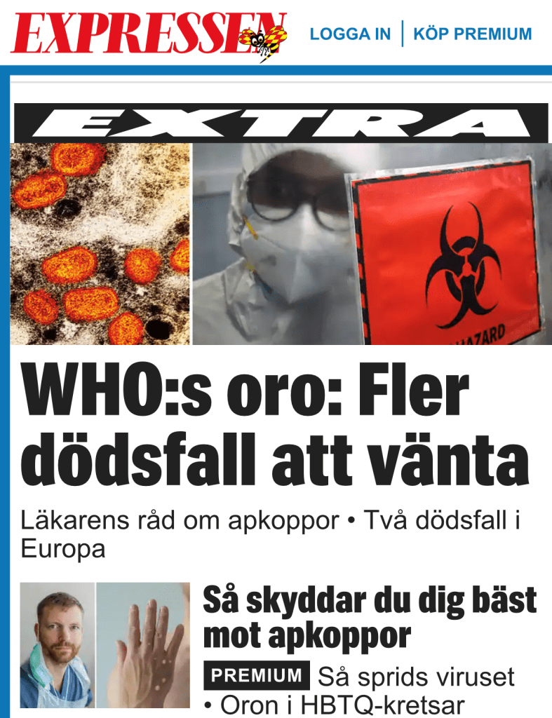 Coronapandemi i Sverige 2020 Vi befinner oss just nu i den värsta pandemin som drabbat världen sedan spanska sjukan men Folkhälsomyndigheten i Sverige vill inte rekommendera människor att bära munskydd för att skydda sig själva och andra människor. Anledningen är att det, enligt myndigheten, inte finns några konkreta vetenskapliga bevis för att sådana skydd fungerar samt att svenska folket tycks ha en märklig benägenhet att ”pillra” på munskydden och få virus på fingrarna som de kan smitta sig själva med eller sprida vidare. Dessutom verkar man tro att munskydd skulle göra att sjuka människor springer omkring på stan, iklädda munskydd, istället för att stanna hemma om de är sjuka.