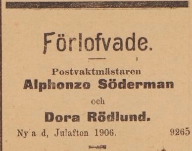 Det var tuffa tider i vårt land och för syskonen Rödlund, som för så många andra, gällde det att snabbt bli vuxna och tjäna sitt levebröd. För döttrarna blev det viktigt att gifta sig tidigt och få det tryggt. Dora förlovade sig på julaftonen 1906 med den sjutton år äldre posttjänstemannen Alphonzo Söderman. Paret gifte sig i Ytterlännäs två år senare, 1908 och 1910 föddes parets första barn, min farmor Margit Alice i Nyland. Alphonzo verkade till en början vara en bra karl och Dora hoppades på en trygg och bra framtid med ett eget hem och många barn. Men i kyrkböcker och gamla tidningar kan man se att Alphonzo tyvärr inte var så mycket att ”hänga i julgranen”. I alla fall inte om man önskade ett tryggt liv och en fast boplats. Alphonzo var ständigt på resande fot. Han for och flackade över hela Norrland – en tid som postvaktmästare, en annan som ”handelsagent” och slutligen som ölutkörare och gårdfarihandlare. Redan 1905 dömdes han för fylleri, misshandel och ärekränkning efter att ha överfallit en annan postvaktmästare på mannens kontor. Åren 1912 och 1913 hamnade han i finkan igen, dömd för stöld.