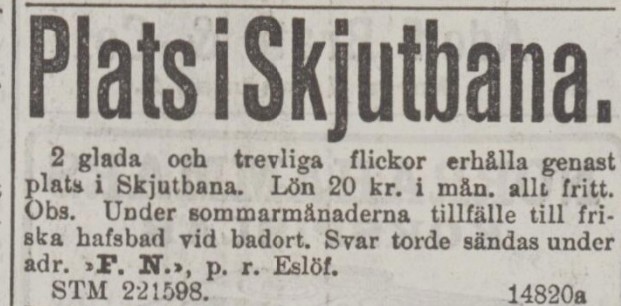 På 1910-talet blev folkparkerna ett kärt nöje för många svenskar och ambulerande tivolin och marknader besökte de många parkerna runt om i landet. I dagstidningar annonserade man efter personal, gärna unga, söta flickor som skulle sköta skjutbaneattraktionen och vara ”ansiktet utåt”. Som ”skjutbanefröken” laddade man luftgevären, tog betalt, delade ut priser och lockade publik till ståndet. Denna miljö var präglad av fest, musik och flärd. Det var ett yrke som ofta förknippades med en viss ”showbusiness”-aura och var ett sätt för unga kvinnor att få arbeta i en spännande, rörlig miljö. I de många platsannonserna från den tiden, lockade man gärna med ”uppfriskande havsbad”, resor och betald ledighet under sommarmånaderna. Dora var en parant och välsvarvad dam som i sin ungdom kallades ”vackra Dora”.